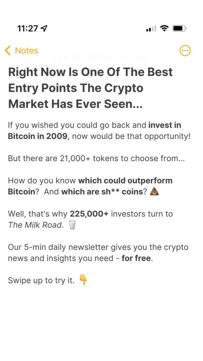 The first and most important reason why I think this advert was created in this style is that it allows the consumer to level with the brand. You feel you feel like your being sent this by your friend and it’s some insider information you shouldn’t know about. And that's exactly what the Milky Road Newsletter is. Insider information about Crypto. So this is the perfect way to advertise it.