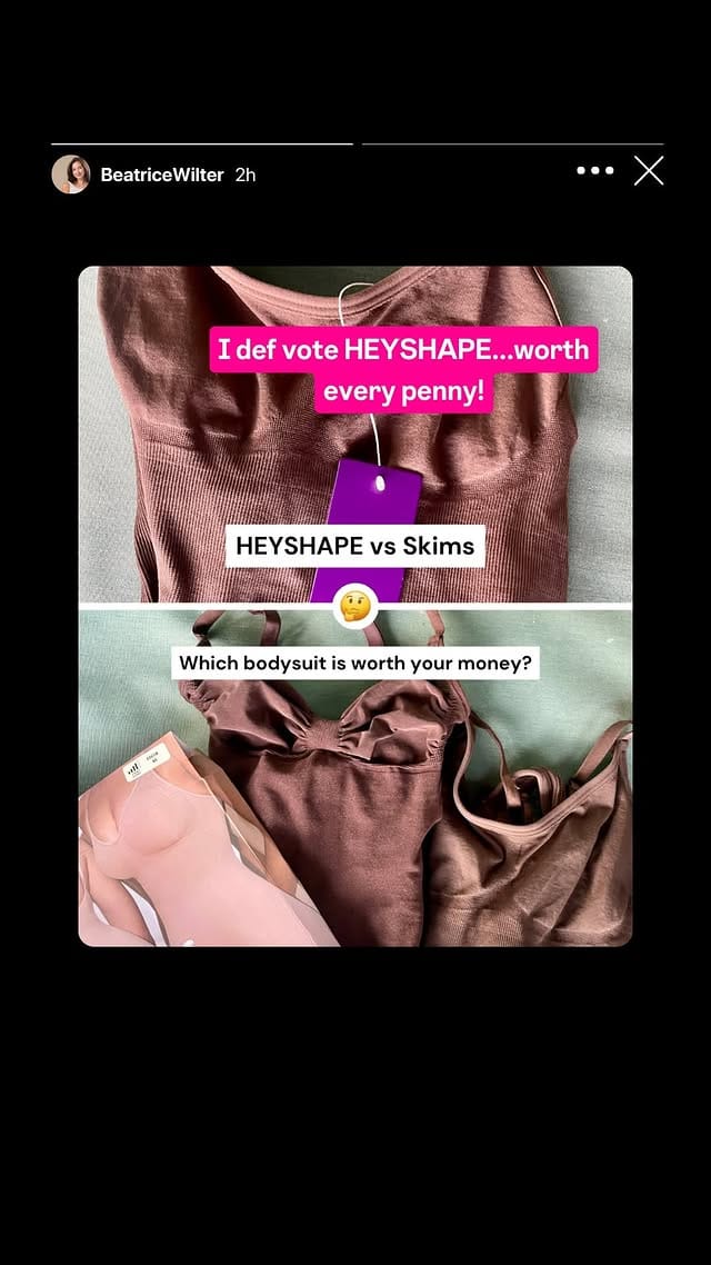 HeyShape Absolute Masters at Positioning. This advertorial is a perfect example. It's designed like something that you'd organically see on Instagram Stories, calling out their core competitors, driving traffic to a comparison page where they compare their headline product to a similar one from Skims and surprise surprise, HeyShape comes out on top.