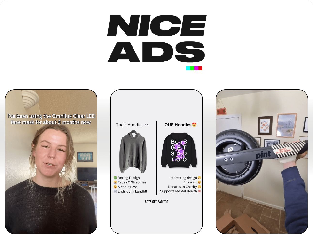 Ads like this aren’t hard to create. In fact in this week’s Nice Ads premium you’ll find a very similar template 🤫. But no matter if you use the template or not, it’s creative like this that can be used to get a leg up in a competitive niche like clothing. Do your research to why people will buy from you over others and what they hate about those competitors and then write that into the creative. Simple.