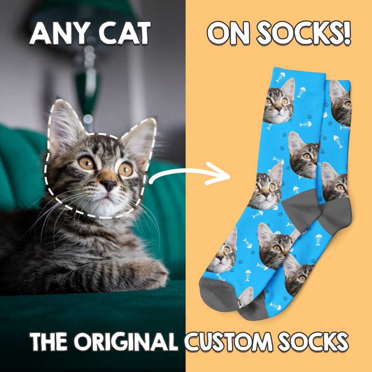 A lot of people's reservations about this product will be time and skill, "How long does this take?" "Do I have to edit the photo?". So showing the process in a visual way allows the customer to fully understand how the service works. You take a photo of your pet. They cut out the face and place it on socks.