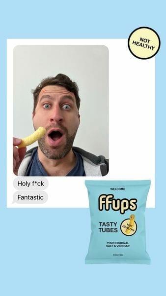 Ffups is a playful DTC brand that intentionally makes “NOT HEALTHY” snacks. They took the delight of a crunchy puffed snack, then boosted it with a bunch of different fun flavours - like cheddar, hot chocolate, cinnamon toast, and more.